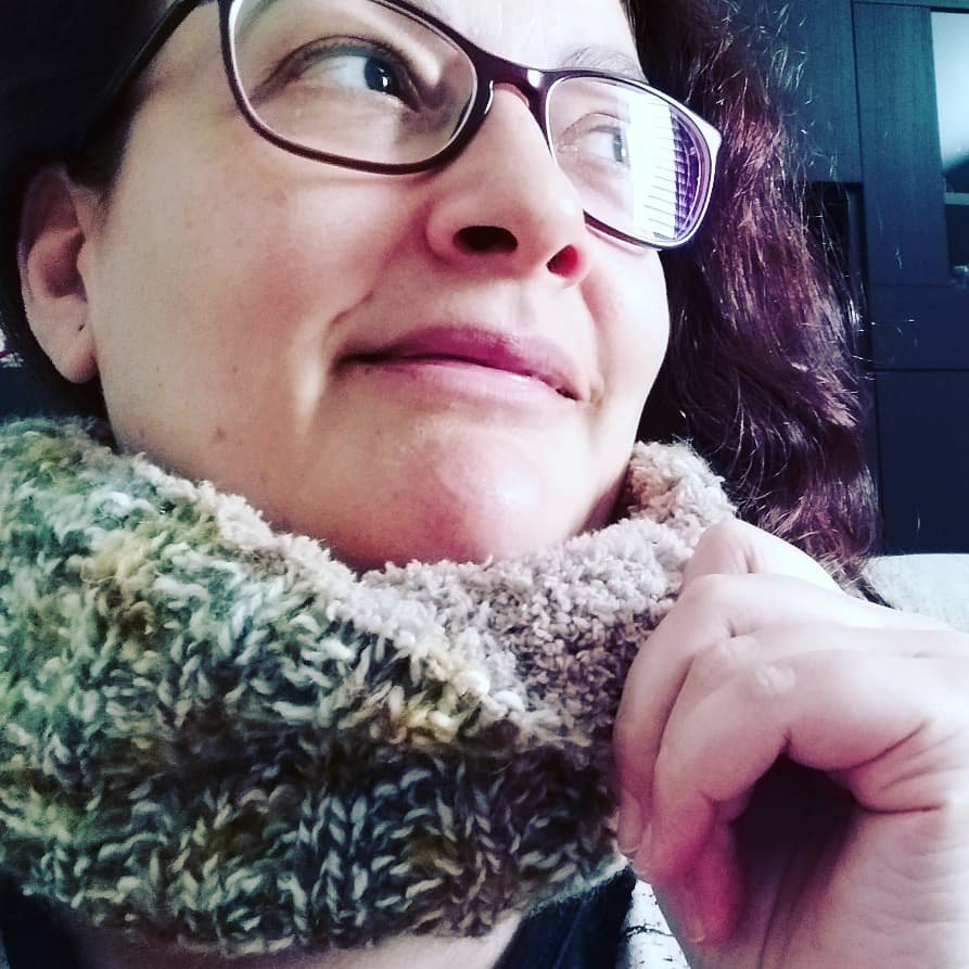 Quería hacer un regalo a un familiar, y pensaba en algo calentito para el cuello, que fuera agradable al roce con la piel. Tenía un ovillo suelto de lana Oso Blanco en tonos verdes trenzado con un hilo blanco, que se llama Gales 60% acrílico 15% lana 15% poliamida 10% mohair. Para la parte interior elegí un marrón claro en peluche de Schachenmayr Baby Smiles Lenjasoft, para que no picaran las fibras naturales.