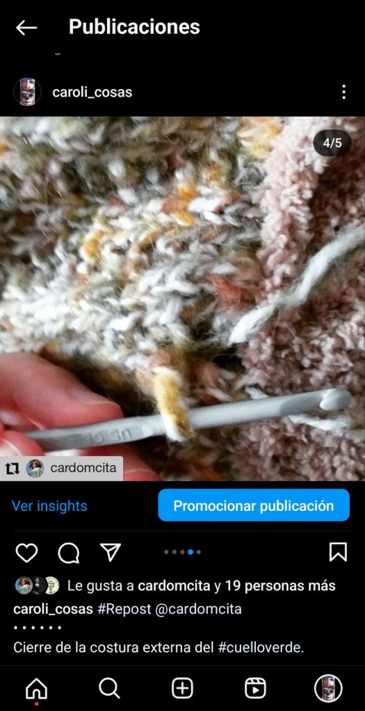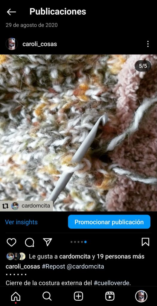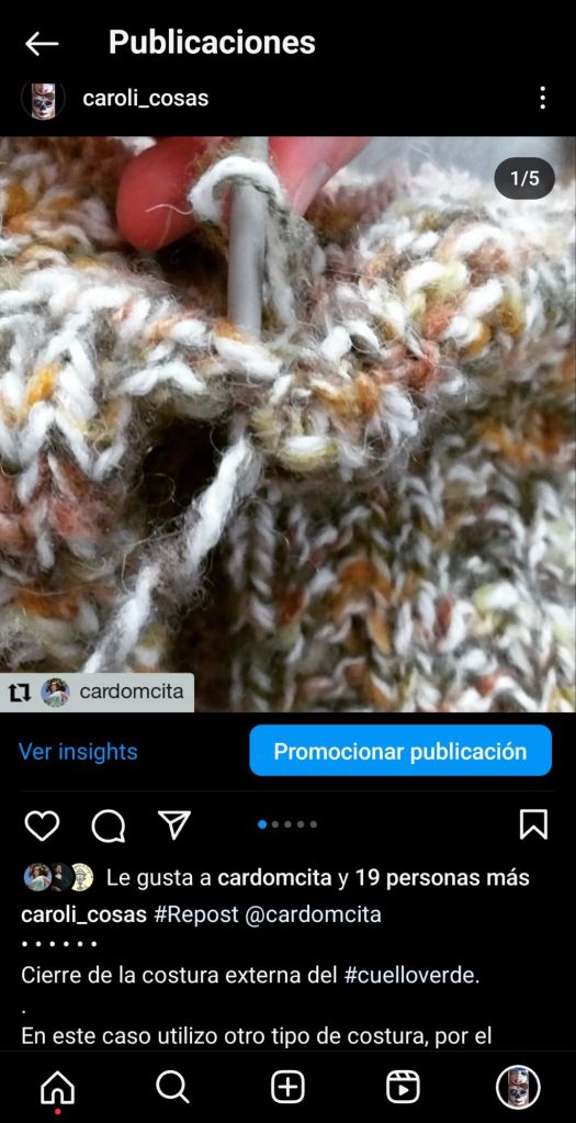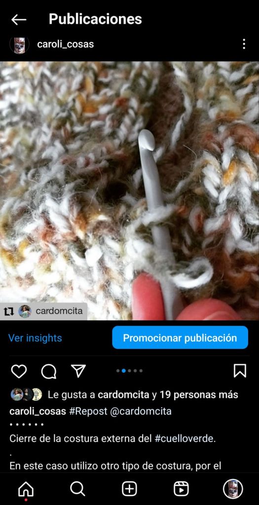 #Repost @cardomcita • • • • • • Cierre de la costura externa del #cuelloverde. . En este caso utilizo otro tipo de costura, por el derecho de la labor: se trata de coger un punto de cada lado con una aguja de #ganchillo #crochet y pasar una anilla de lana a través de los 2 puntos y de la anilla anterior. . Así, se ve una cadeneta que se camufla con la textura de puntos. Hay que hacerlo flojo para que el cuello quede elástico y cómodo. . #knittersofinstagram #Knitter #knistagram . #Carolicosas #Caroli_Cosas https://www.instagram.com/p/CEfWwdRlSRt/?igsh=NXJxYWNvNHZueTVz