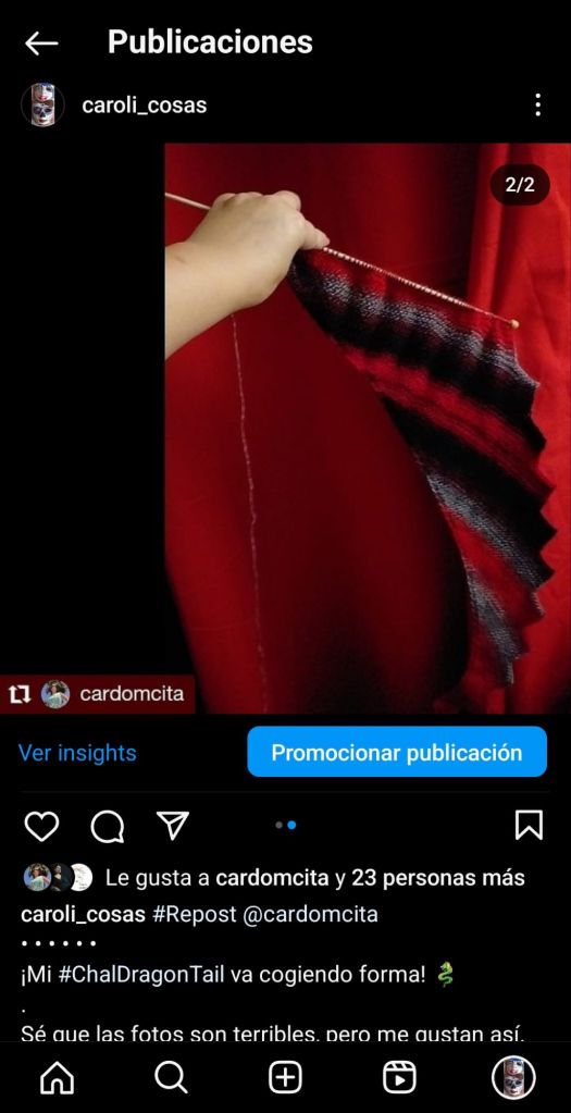 #Repost @cardomcita • • • • • • ¡Mi #ChalDragonTail va cogiendo forma! 🐉 . Sé que las fotos son terribles, pero me gustan así. . Me parece que no va a ser suficiente con un solo ovillo.. ¡a ver cómo me las ingenio para encontrar otro! . @katiayarns #Polaris #dragontail #knitting #2agujas #punto #coladedragón #LanasKatia #chal #chales #shawl #schawl #knittersofinstagram #Knitter #knistagram #knittersoftheworld #makersgonnamake #handmadewardrobe #instayarn #yarnstagram . #Carolicosas . Más en: https://carolicosas.com/2019/09/19/mi-version-del-chal-dragon-tail/ . #Caroli_Cosas https://www.instagram.com/p/CFNTIG6lSXD/?igsh=MTlkODVnaHpmcjc0cA==